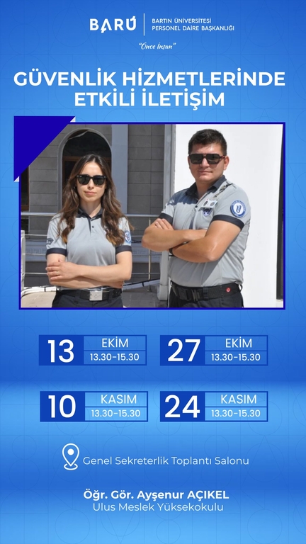 Üniversitemiz Ulus Meslek Yüksekokulu Büro Hizmetleri ve Sekreterlik Bölümü Büro Yönetimi ve Yönetici Asistanlığı Programı Öğretim Görevlisi Ayşenur AÇIKEL tarafından "Güvenlik Hizmetlerinde Etkili İletişim" konulu hizmet içi eğitim programının düzenlenmesi Rektörlüğümüzce uygun görülmüştür. Söz konusu eğitim, 25 kişilik gruplar halinde yapılacak olup, eğitime dair bilgiler afişte yer almaktadır.Duyurular